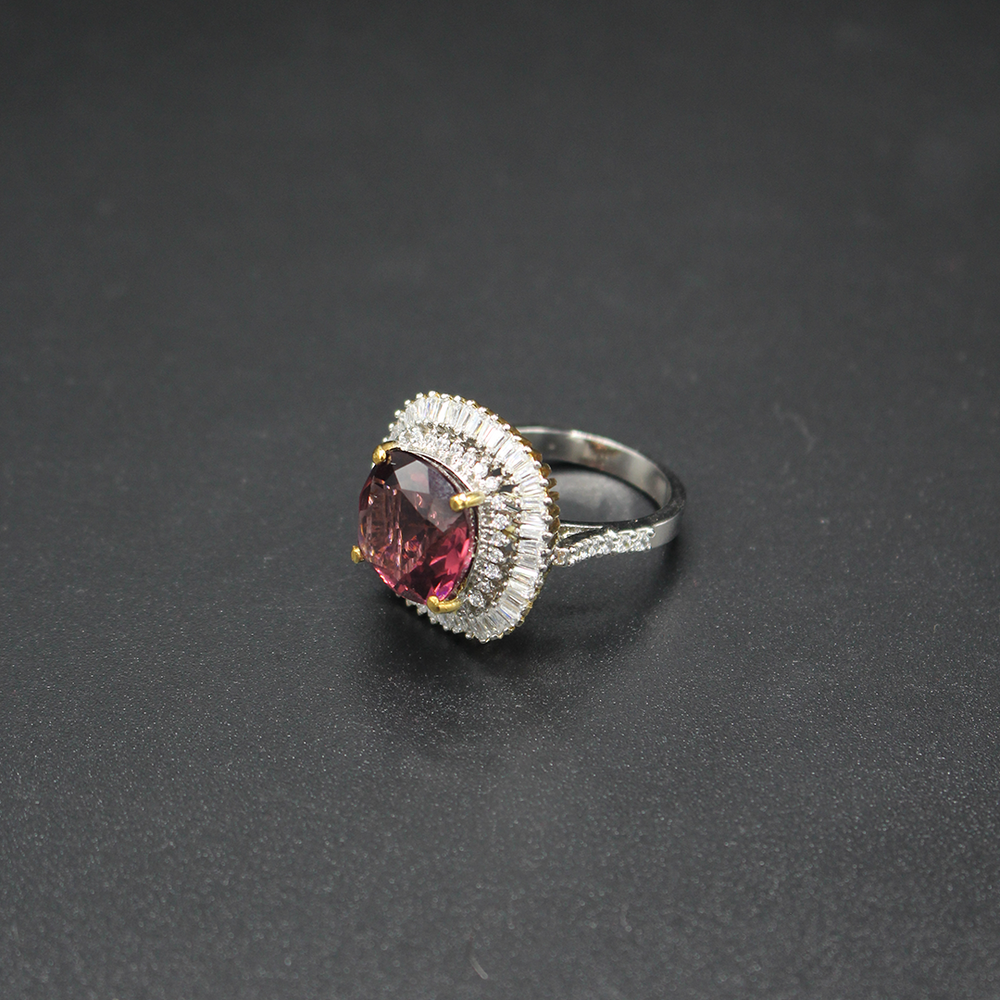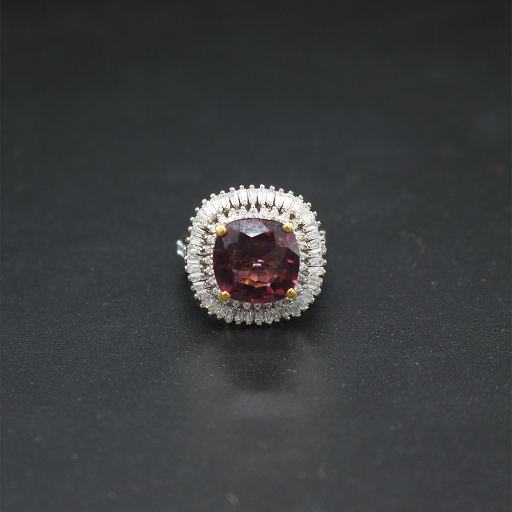 The charm of sterling silver 925 rhodium-plated ring adorned with super fine zircons and a magnificent synthetic stone is truly enchanting.