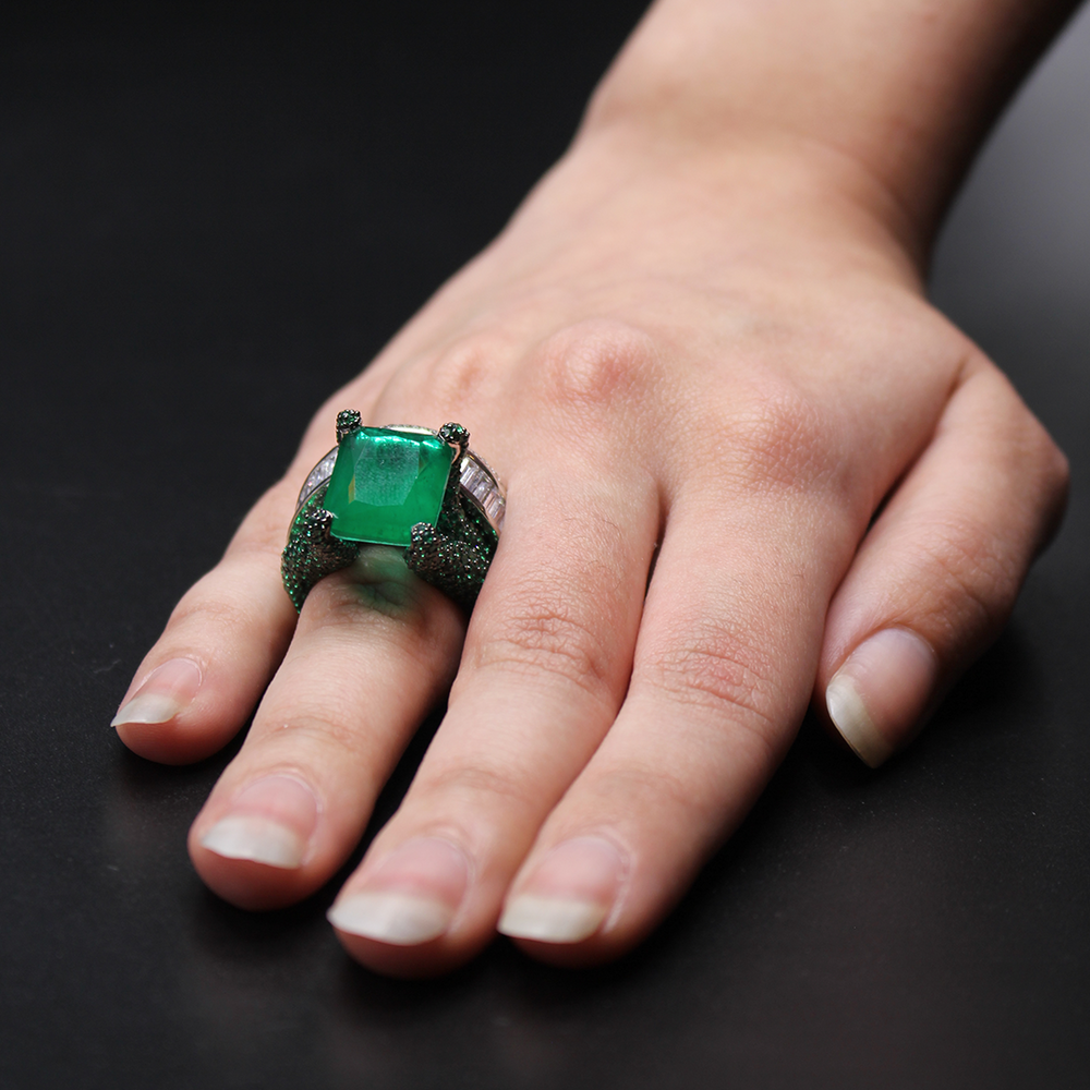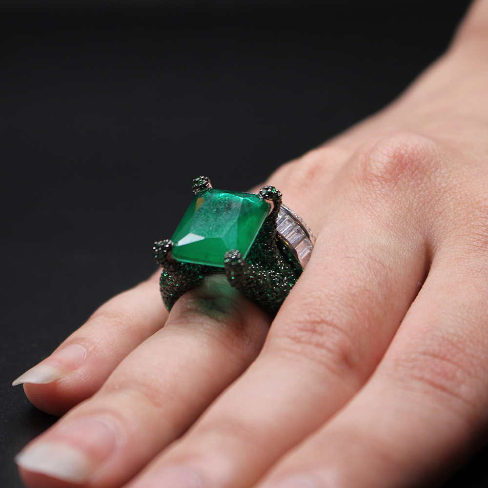 A uniquely handcrafted ring in sterling silver set with beautiful green stone clusters and zircon baguettes.