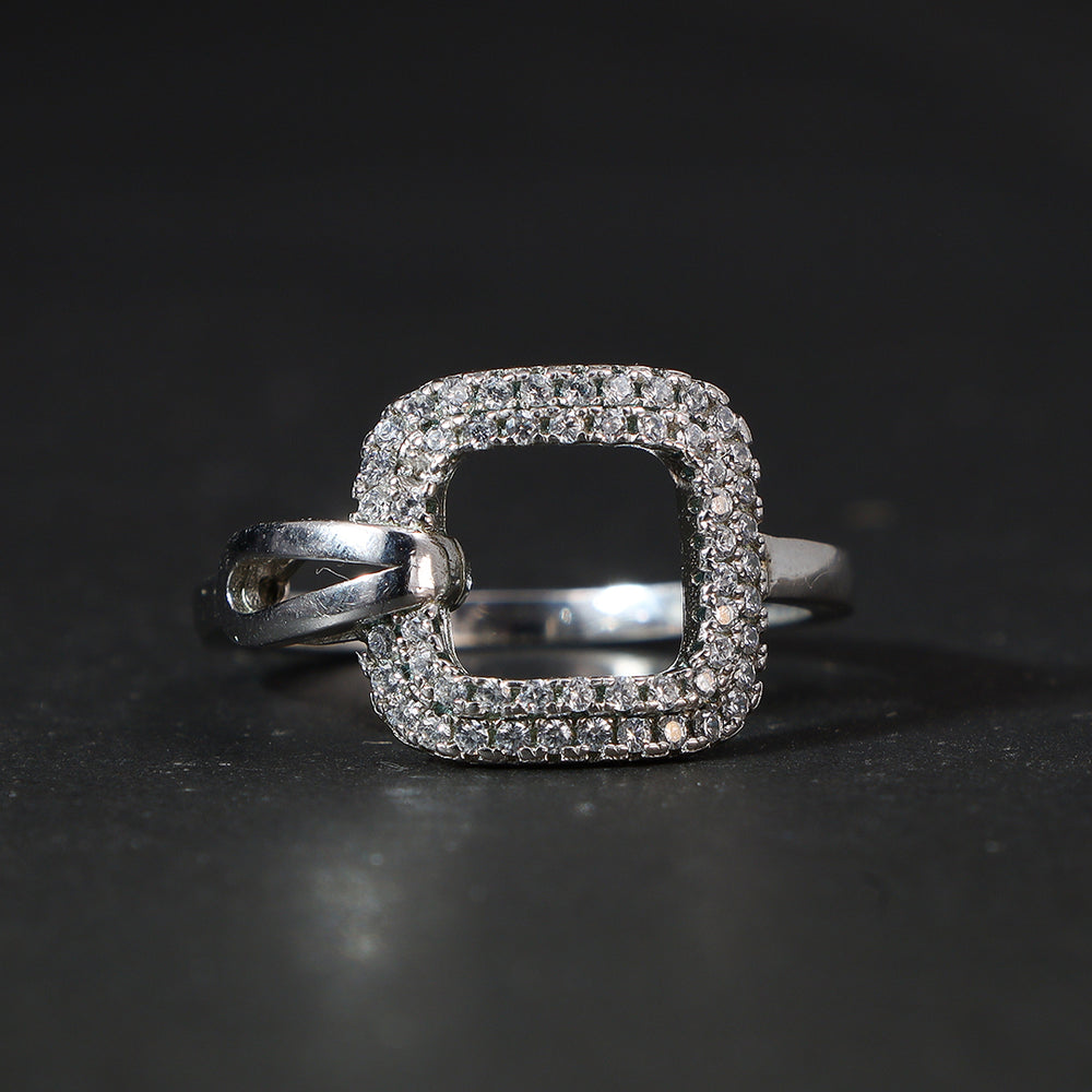 This is a statement ring featuring a distinctive square, open frame design. The open center creates a modern, geometric look. The entire square frame is surrounded by a border of small, closely-set stones in a pavé setting,
