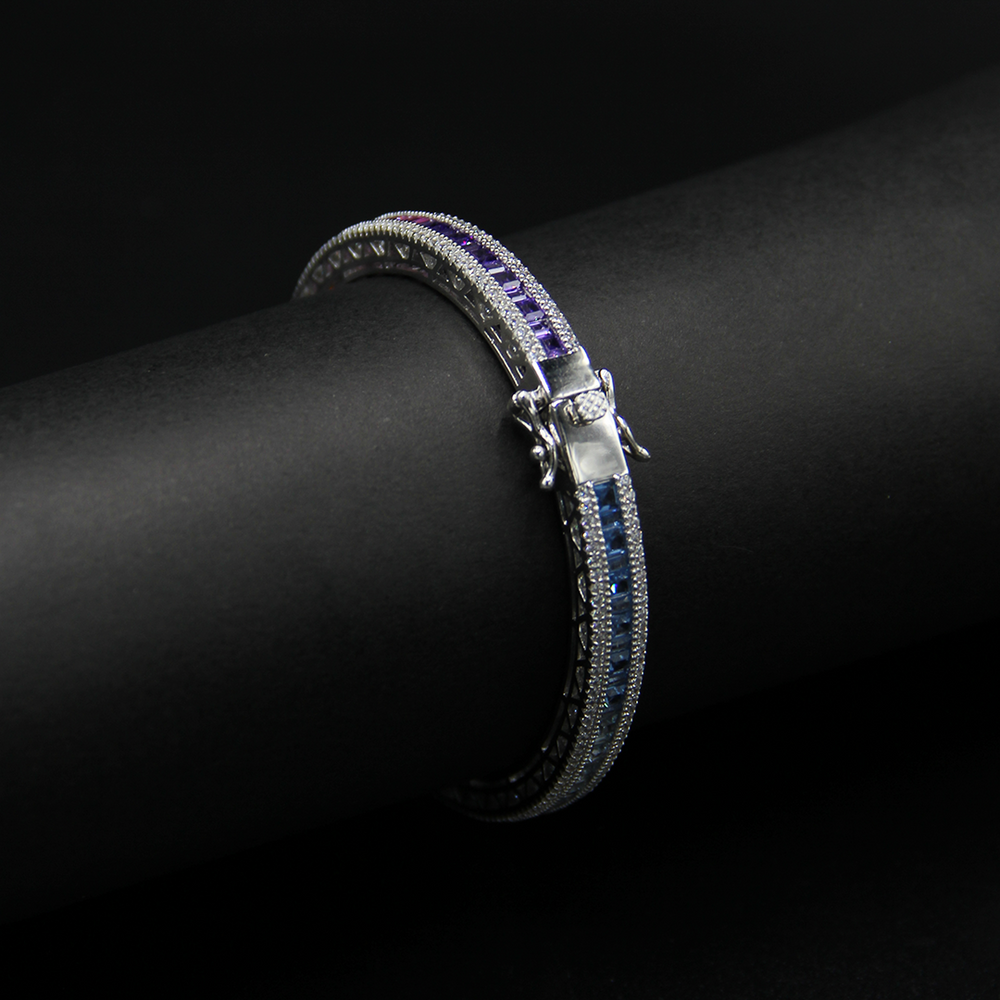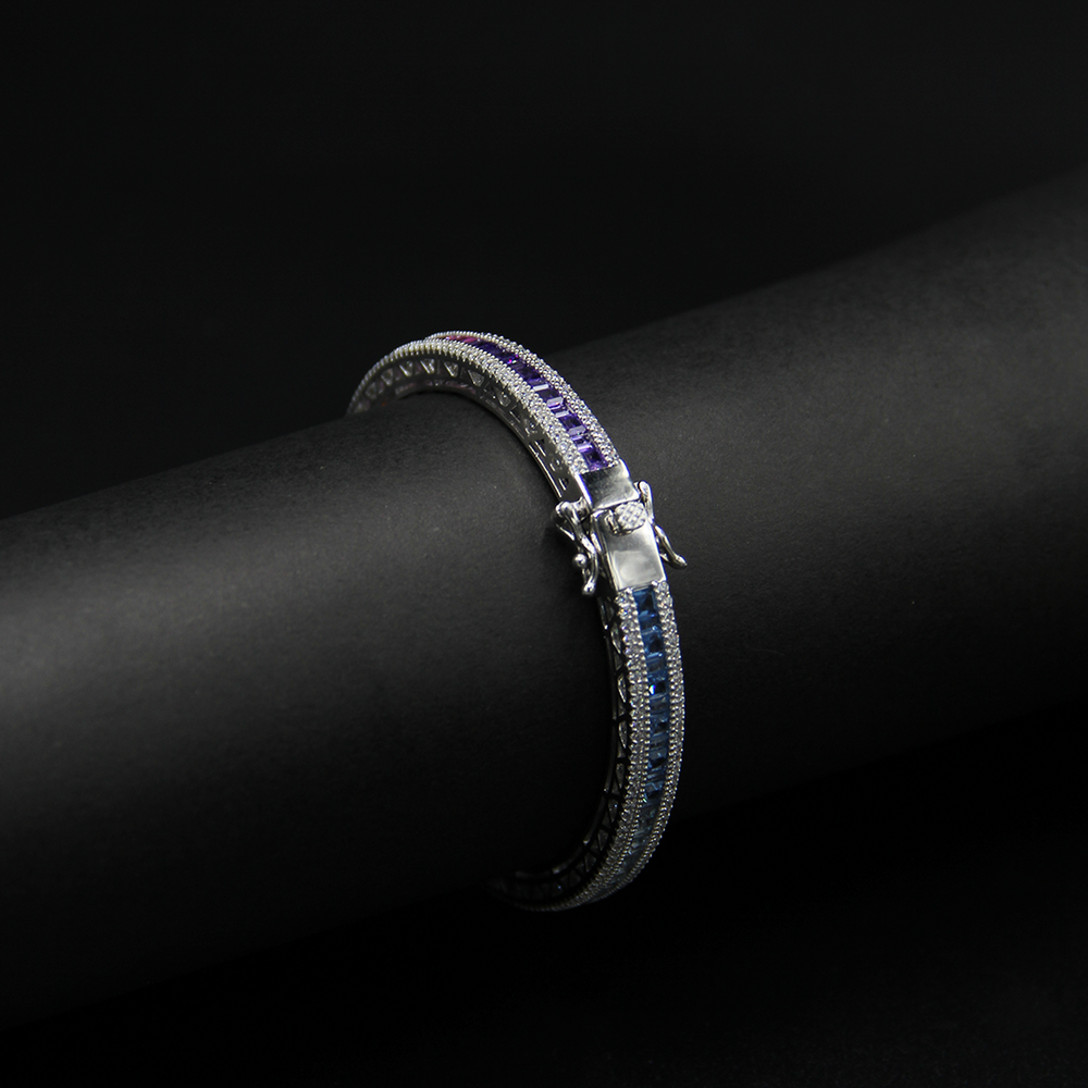 A beautiful bangle in sterling silver set with synthetic stones that bring out an exquisite charm.