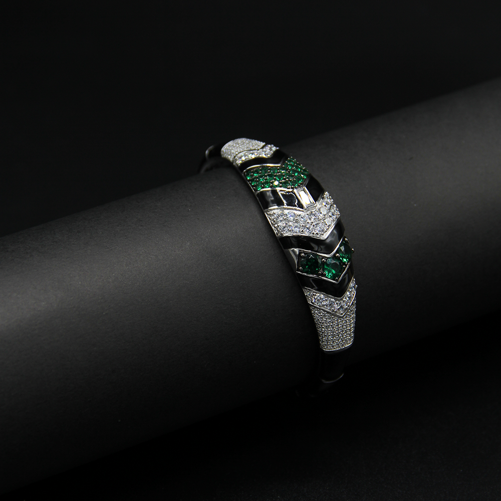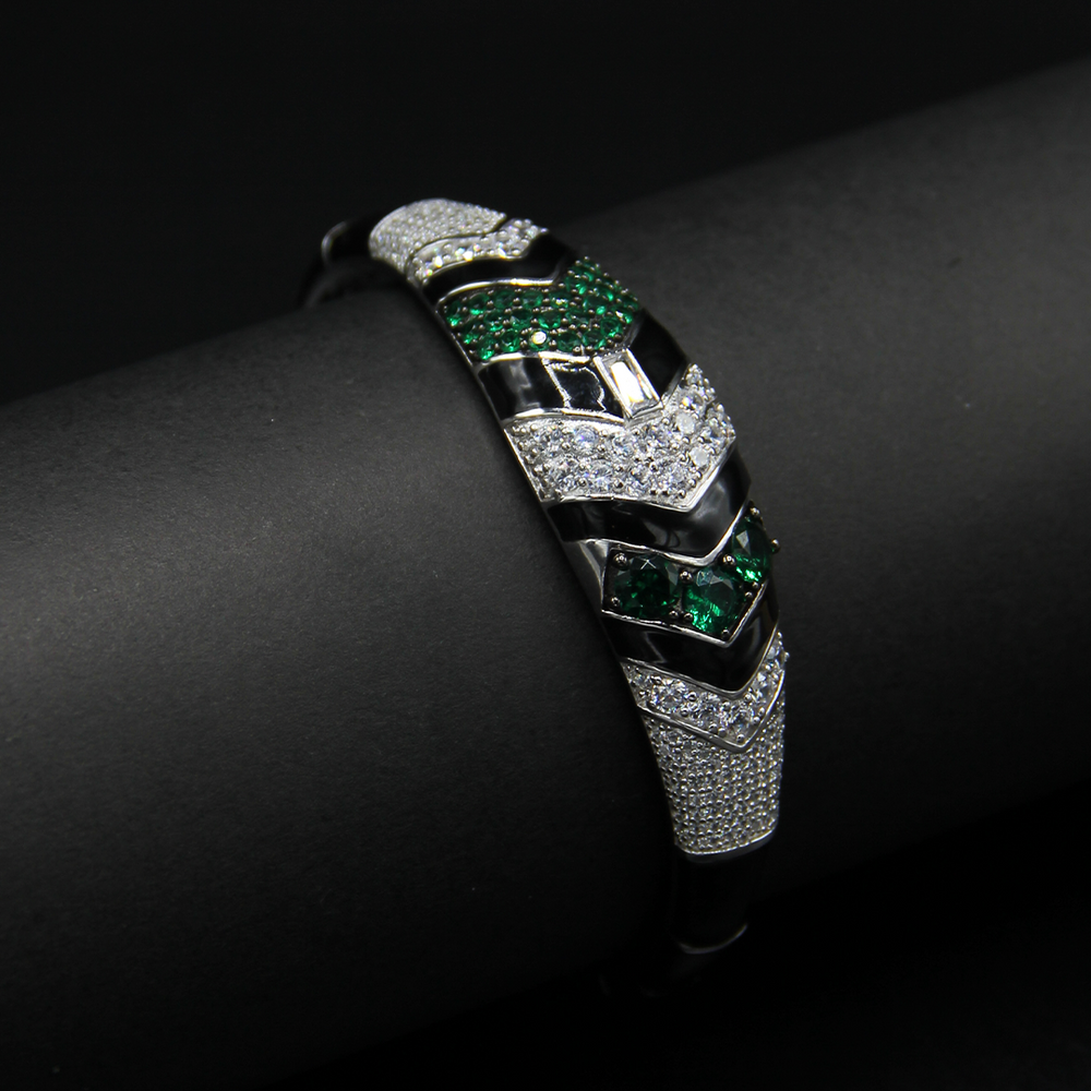 An exquisite bangle made in sterling silver set with beautiful synthetic emeralds and zircons.