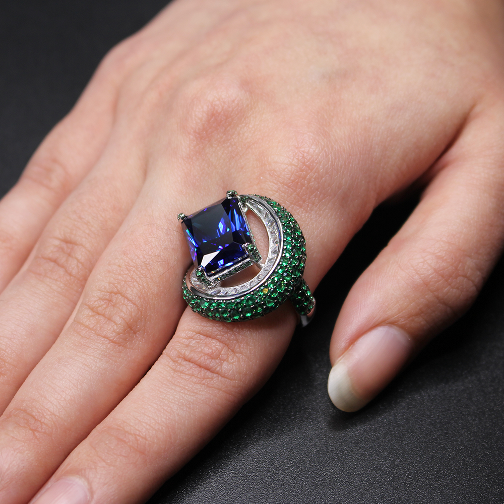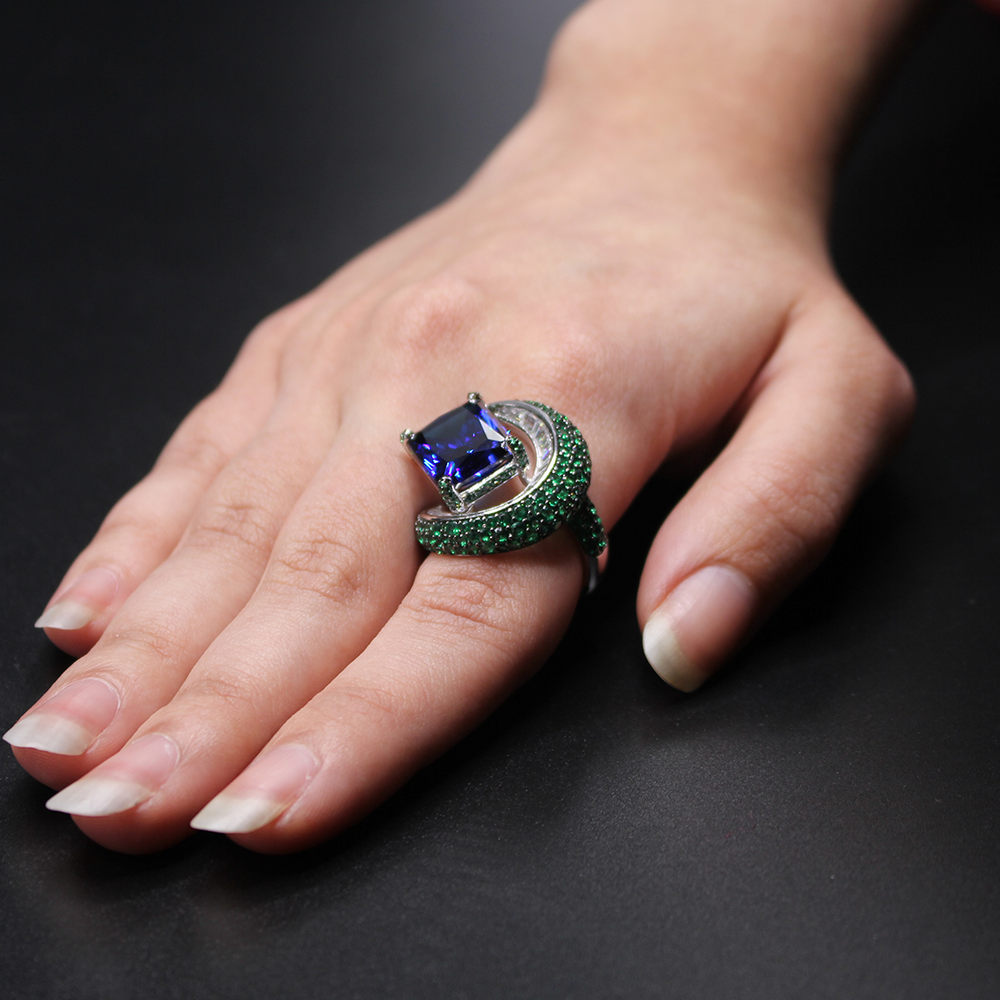 A gracefully crafted sterling silver ring set with synthetic stone clusters and zircon baguettes.