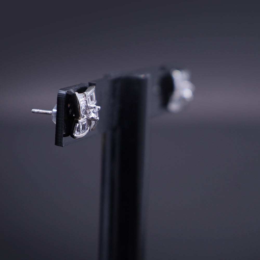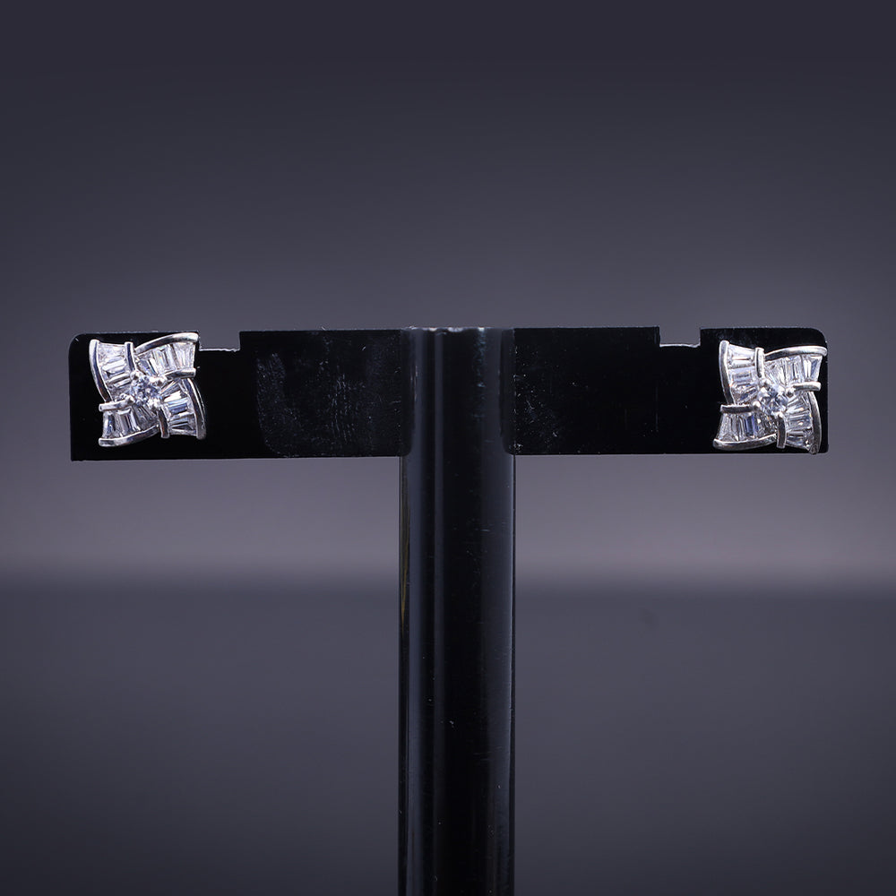 These elegant stud earrings feature a cluster design with a central round-cut stone surrounded by four groups of baguette-cut stones, forming a square or pinwheel shape. The stones are set in a silver-toned metal (likely sterling silver 925