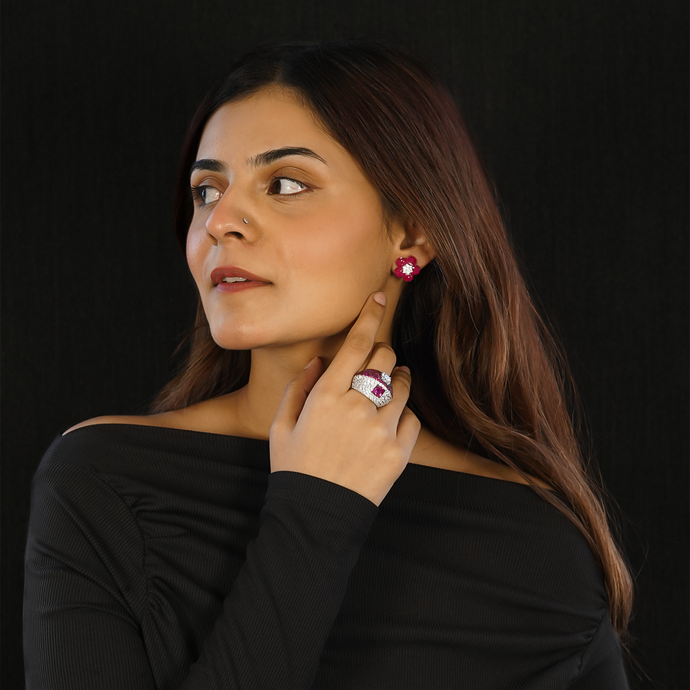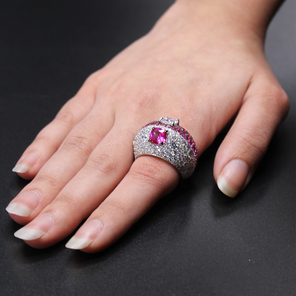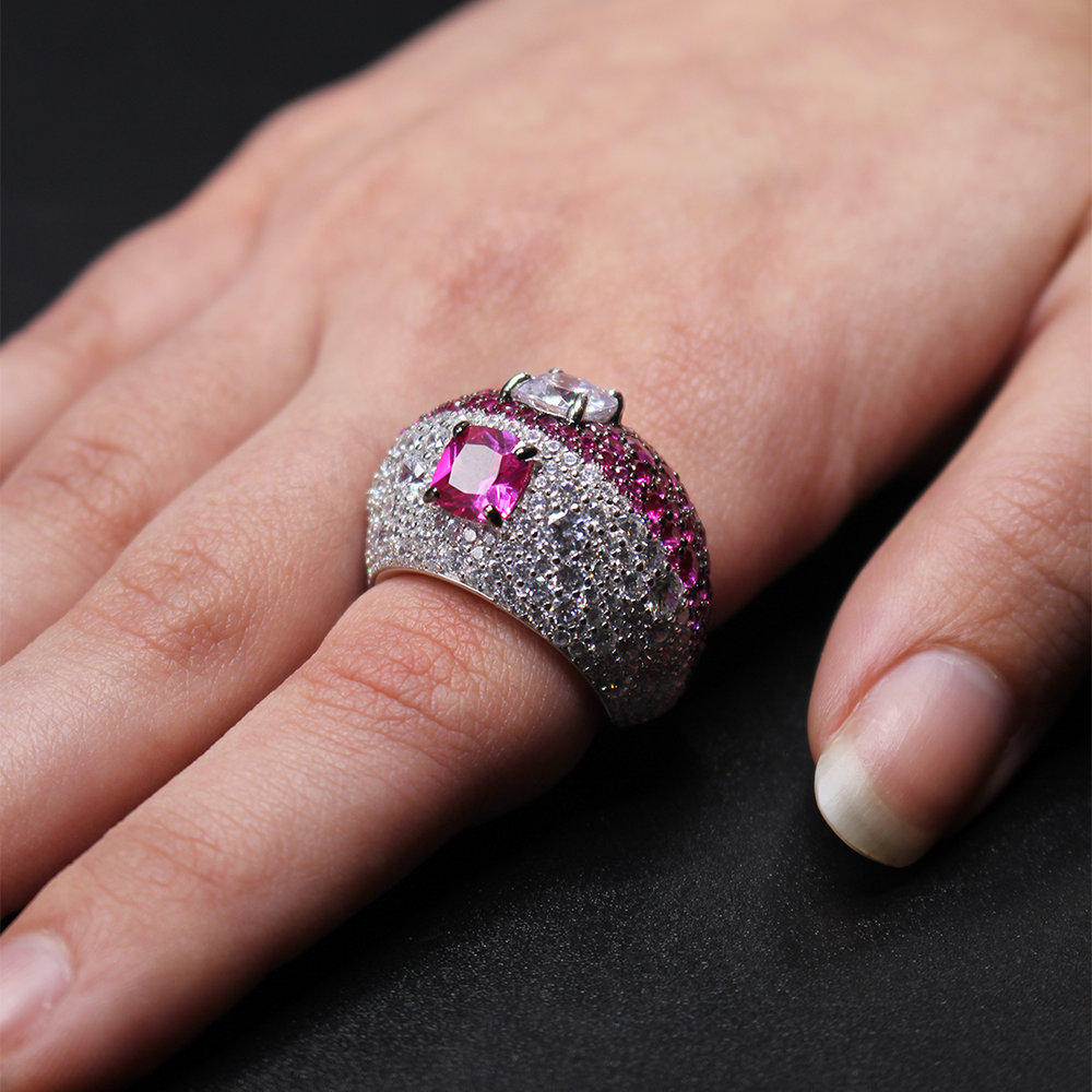 An elegant chunky sterling silver ring set with clusters of pink stones and zircons.