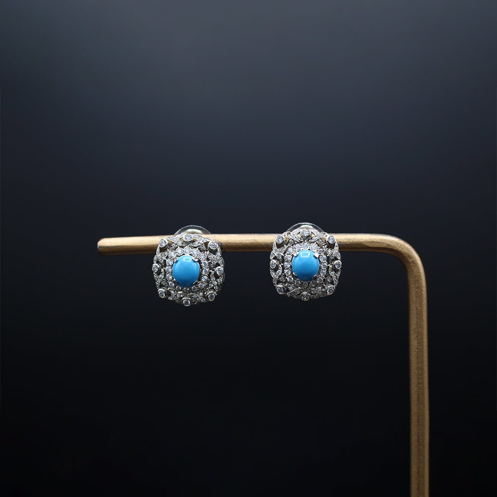 Elevate your elegance with The Elegant Firoza Stud Earrings. A stunning synthetic firoza takes center stage, gracefully seated on a throne adorned with clusters of zircons. Crafted in rhodium -plated silver, these earrings radiate timeless sophistication.