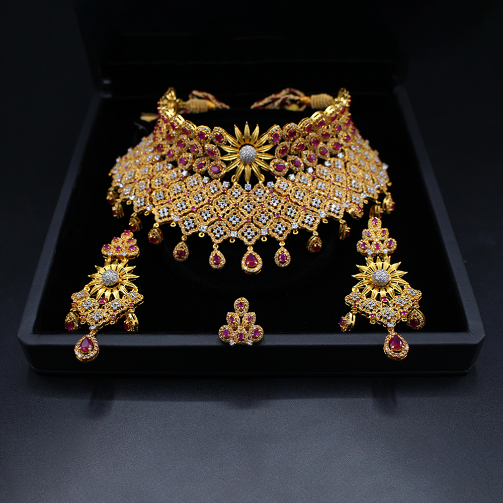 Elevate your style with The Rajasthani Glamour Necklace Set. Adorned with synthetic rubies and zircons, this exquisite piece is crafted in gold -plated silver, offering a perfect blend of elegance and sophistication. Redefine your look with this stunning ensemble that captures the essence of timeless beauty.