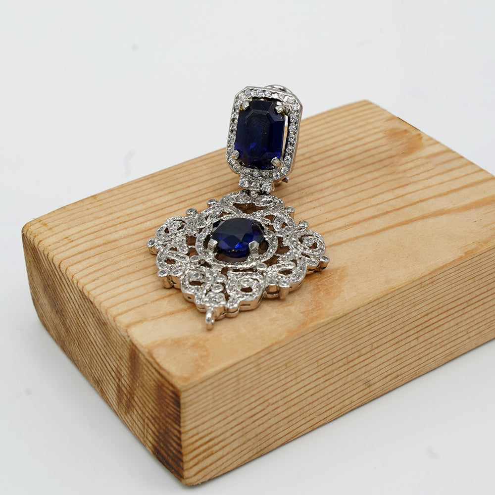 The Regal Intricacy – Silver Rhodium-Plated Drop Earrings, adorned with magnificent blue synthetic sapphires, encircled by high-quality zircons, exuding a truly regal aura. Crafted with precision and attention to detail, these earrings are the epitome of elegance, making a statement at any occasion with their resplendent charm. While the earrings come with captivating synthetic sapphires, you have the option to request genuine sapphires, though it comes with a slight increase in the product cost.