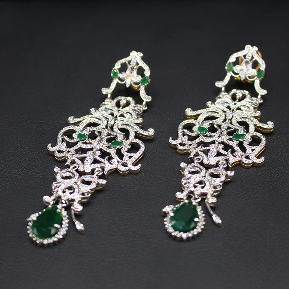 Indulge in the regal allure of The Victorian Mughal Dangling Earrings. Crafted with precision, these earrings feature synthetic emeralds elegantly encased in high -quality zircons, all set in rhodium -plated silver. Elevate your style with this exquisite blend of tradition and sophistication .